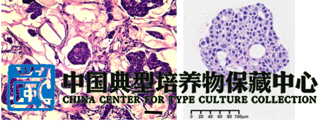 | HE 染色结果说明 | 左为乳腺癌组织,右为乳腺癌类器官。乳腺癌组织细胞排布紊乱,有管腔,肿瘤细胞聚集形成结节。乳腺癌类器官有腺腔结构,细胞大小不均一(乳腺癌分型不同,其类器官形态也不一样)(比例尺100 μm)。 | ||