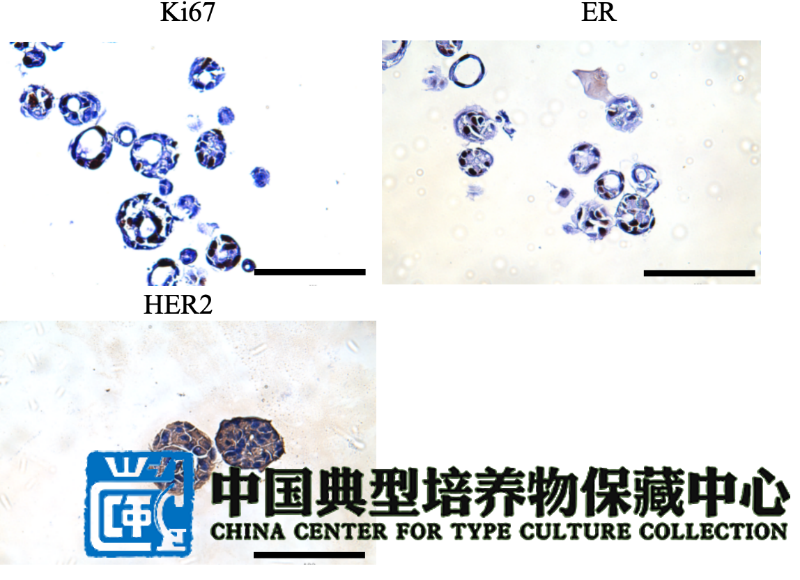 | 鉴定结果说明 | Ki67,分裂增殖期细胞标志物;ER(雌激素受体)和 PR(孕激素受体)属于核激素受体家族成员,与配体结合后具有转录因子的作用,在乳腺癌的发生发展中起到重要作用。在乳腺癌类器官中,部分细胞可被Ki67,ER所标记,几乎所有细胞都能被HER2所标记(比例尺100 μm)。 | ||